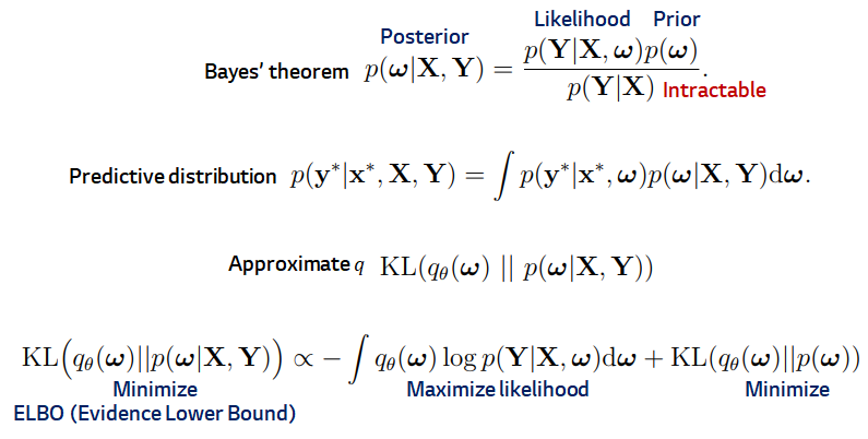 직접 weights에 대한 posterior를 구할 수 없기 때문에 q로 approximate한다. q는 Gaussian (Bayes by Backprop)으로 가정할 수도 있고, Dropout으로 (Dropout as Bayesian Approximation) 모델링 할 수도 있다. q로부터 weights를 sampling하여 training 또는 inference를 수행한다고 생각할 수 있다.
