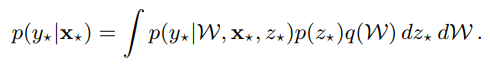 위 식에서 randomness는 p(z)로부터 발생하는 noise와 W ~ q(W)에 기인한다. p(z)는 observation에 내재된 noise로 irreducible하며 (aleatoric), q(W)는 더 많은 데이터의 수집으로 approximation을 잘하면 randomness를 줄일 수 있다.